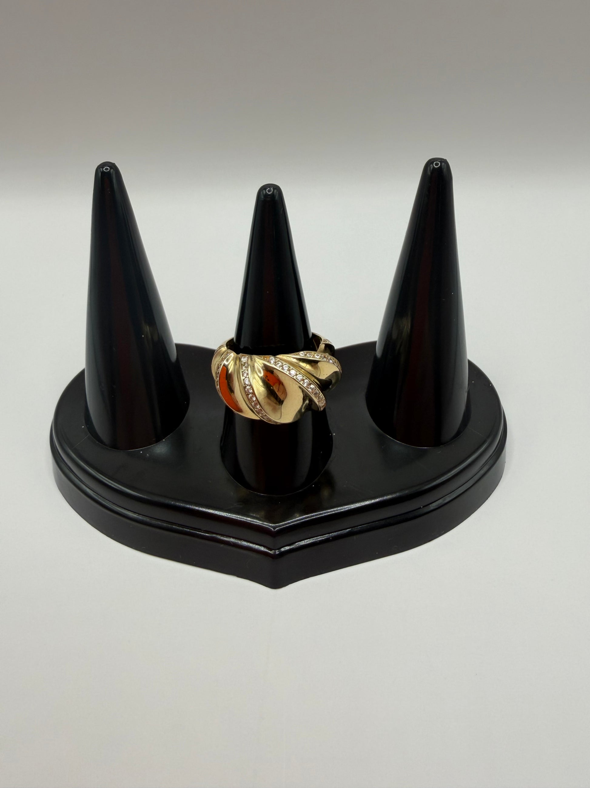 "Sofisticado anillo en oro de 14k con diseño entrelazado y elegantes líneas adornadas con circonitas brillantes. Acabado pulido y satinado que crea un hermoso contraste. Talla 7. Diseño moderno y atemporal perfecto para uso diario o como pieza de declaración. Calidad premium con acabado duradero."